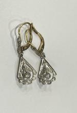 PAIRE DE PENDANTS D'OREILLES en or jaune et gris 750/°° sertis chacun de deux roses. Travail français, vers 1900. H. 2.5 cm. Poids brut : 1.46 g. Petites égrisures, un anneau légèrement ouvert, petite restauration.
