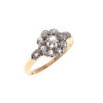 BAGUE "Fleur" en or jaune 750/°° sertissure en platine 850/°° ornée de diamants taillés en rose et épaulé de plus petits (petits manques). Tour de doigt : 59. Poids brut :3.2 g.