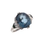 BAGUE Art déco en platine 850/°° ornée en son centre d'une topaze ovale bleue épaulée de diamants taille 8/8, baguette et émeraudes. Numéroté à l'intérieur de l'anneau 5594. Travail français. Tour de doigt : 49. Poids brut :4.7 g. Infimes égrisures.
