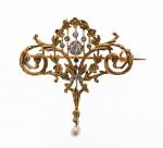 BROCHE "Volutes" en or jaune 750/°° à décor de volutes, de guirlandes fleuris et d'enroulements sertis de diamants, d'un saphir blanc au centre? (égrisures) et d'une perle en pampille. Travail français, fin du XIXème siècle (épingle rapportée). 4.5x4.5 cm. Poids brut :10.5 g.