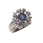 BAGUE à motif rayonnant en platine 850/°° et or gris 750/°° sertie au centre d'un saphir (à repolir) entourée de huit diamants taillés en brillant . Tour de doigt :54. Poids brut :7.6 g. Importantes égrisures de la pierre centrale, un petit manque à un diamant.