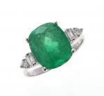 BAGUE en or gris 750/°° de style Art Déco sertie d'une émeraude de taille émeraude de 4.6 ct environ épaulée de diamants taillés en brillant et baguette. Origine probable: Colombie. Tour de doigt : 53. Poids brut :3.2 g.