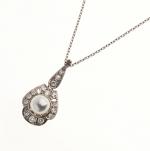 PENDENTIF en or gris 750/°° serti de diamants de taille ancienne et 8/8 entourant une perle de 7.5mm environ. Travail français, style Art Déco. Poinçon de maître RK étoile. Chaine en or gris 750/°°. H. du pendentif : 3.2 cm. L. chaine ajustable : 38-41-44 cm. Poids brut : 6.3 g.