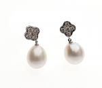 PAIRE DE PENDANTS D'OREILLES en or blanc 750/°° ornés chacun d'une perle de culture d'eau douce surmontée de diamant taillés en brillant. Poids brut :3.0 g.