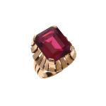 BAGUE en or jaune 750/°° ornée d'un rubis de synthèse de taille rectangulaire à pans coupés taillés à dégrés. Travail français des années 1960. Tour de doigt : 53. Poids brut : 9.9 g. Anneau ressoudé