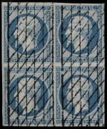 Timbre N°20 - Bloc de 4 timbres oblitérés : 25c bleu. Très belle pièce Oblitération Grille sans fin. Signé Calvès. Cote 2750€