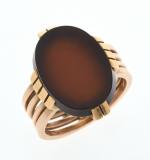 BAGUE chevalière en or rose 750/°° sertie d'une plaque d'agate brune non gravée. Travail français,...