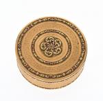 BOITE à pilules en ors jaune et rose 750/°° ciselés et gravés à décor de frises de fleurettes. Epoque XVIIIe siècle. D: 6 cm. H: 2 cm. Poids: 87.01 g.