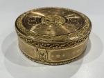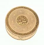 BOITE à pilules deux ors jaune et rose 750/°° à décor de chien et d'oiseaux dans un jardin dans une réserve, frises florales ponctuées d'éléments architecturaux et guirlandes. Travail français, fin du XVIIIème - début du XIXème siècle. Poinçon au coq 3ème titre (1798 à 1809) et poinçon de petite garantie Département tête de coq tournée vers la gauche (1798 à 1809) 7.4 x 2.6 cm. Poids: 107.8 g.