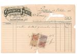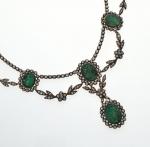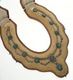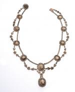 Important COLLIER "Draperie" monté sur or rose 750/°° et argent 800/°° à décor de frises de fleurettes entièrement serties de diamants taillés en rose et taille ancienne et encadrant dix émeraudes camées représentant des nymphes et muses en chute sur serti clos et plaque en or. Au centre, retenue en pampille une émeraude camée plus importante . Epoque fin du XIXème siècle. Porté ras du cou (36 -40 cm). Poids brut : 72.9 g. Facture d'achat provenant de Constantin Frères, joailliers à Lyon situés au 10 rue Président Carnot. Acheté en 1916. Insculpation obtenue le 26 décembre 1892 et biffé en 1919. Dans son écrin à forme en cuir doré au petit fer. Deux restaurations aux anneaux, un ouvert, manque un diamant de taille ancienne, fissures sur certaines émeraudes, petits manques.