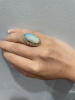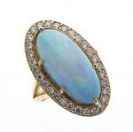 Importante BAGUE "Marquise" en or jaune 750/°° sertie en son centre d'une opale ovale cabochon de 11 ct environ dans un entourage de diamants taillés en brillant pour 0.90 ct environ. Fond fermé par une plaque d'or gris. Mesure de la pierre centrale : 22.5x10.5x9 mm approx. Tour de doigt : 56.5. Poids brut : 10.1 g.