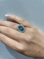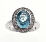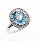 BAGUE "Pompadour" en or gris 750/°° serti d'un important zircon bleu de taille ovale calibrant 6 ct environ dans un entourage de diamants taillés en brillant. Tour de doigt : 57. Poids brut :8.5 g.