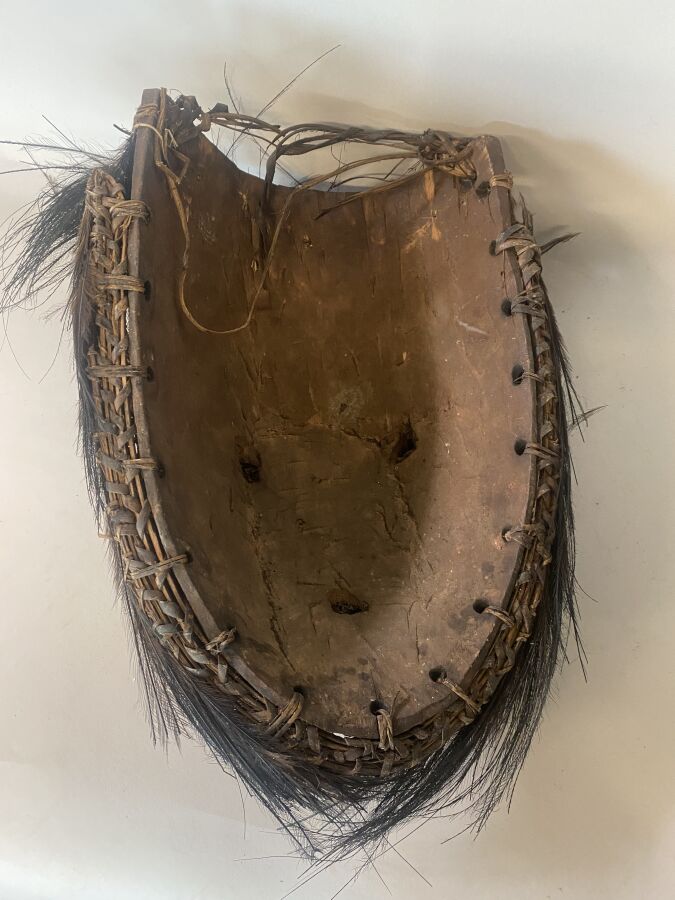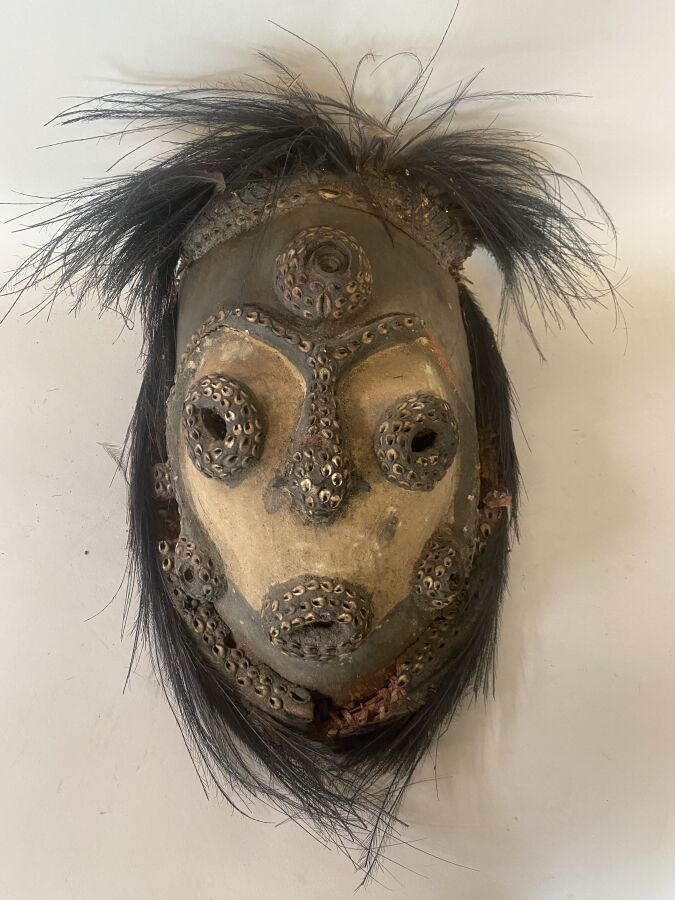 Papouasie Nouvelle Guinée - Masque du Sépik en bois, terre ocre nuancée, coquillages et plumes...