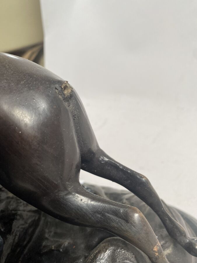 Bronze à patine nuancée, signé sur la base, reposant sur base à marbre noir.