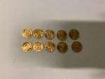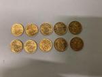 Ensemble de dix PIECES de 20 francs Suisse en or : 1927, 1935, 1947.