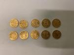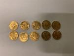 Ensemble de dix PIECES de 20 francs Suisse en or : 1927, 1935, 1947.