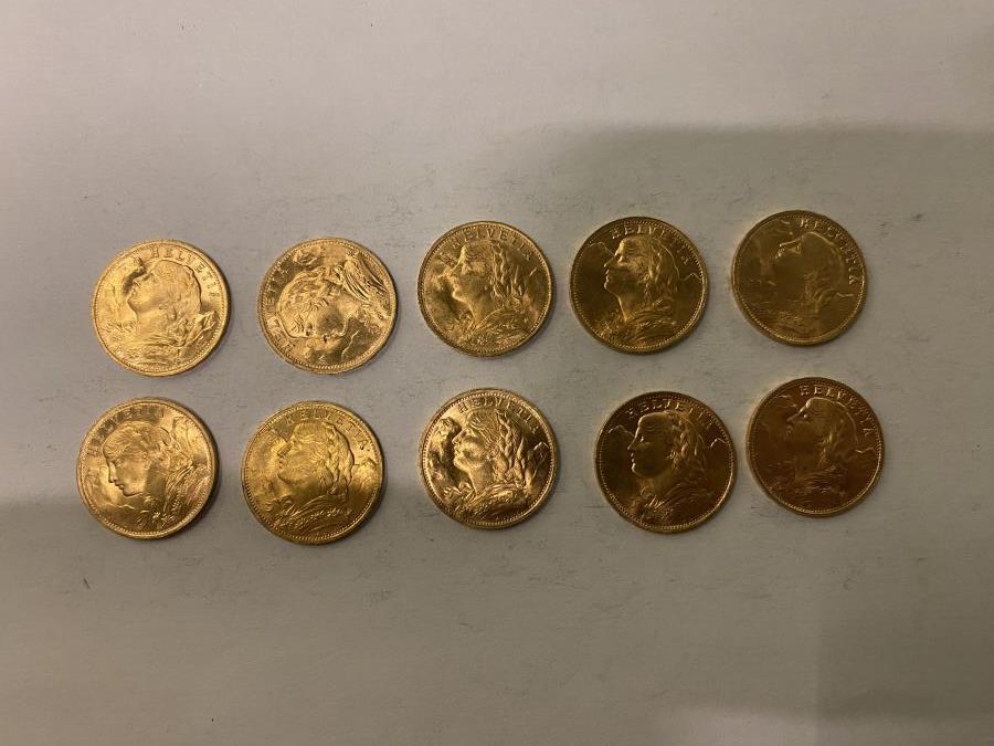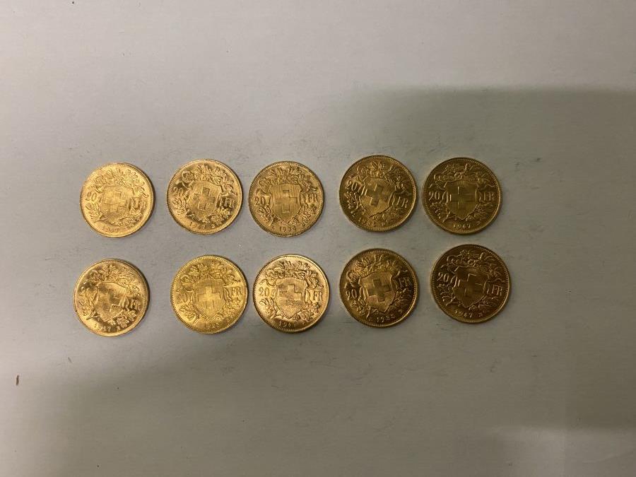 Ensemble de dix PIECES de 20 francs Suisse en or : 1925, 1935, 1947.