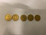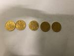 Cinq PIECES en or de 20 Francs ou huit Forints (Autriche) : 1884, 1889, 1882, 1887, 1888.