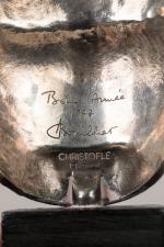 Masque en bronze argenté. Signé, marqué au dos Bonne année 1977 et Christofle. H. 10 cm hors tout