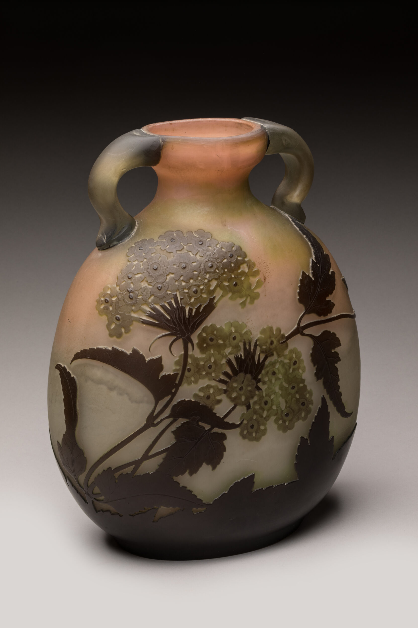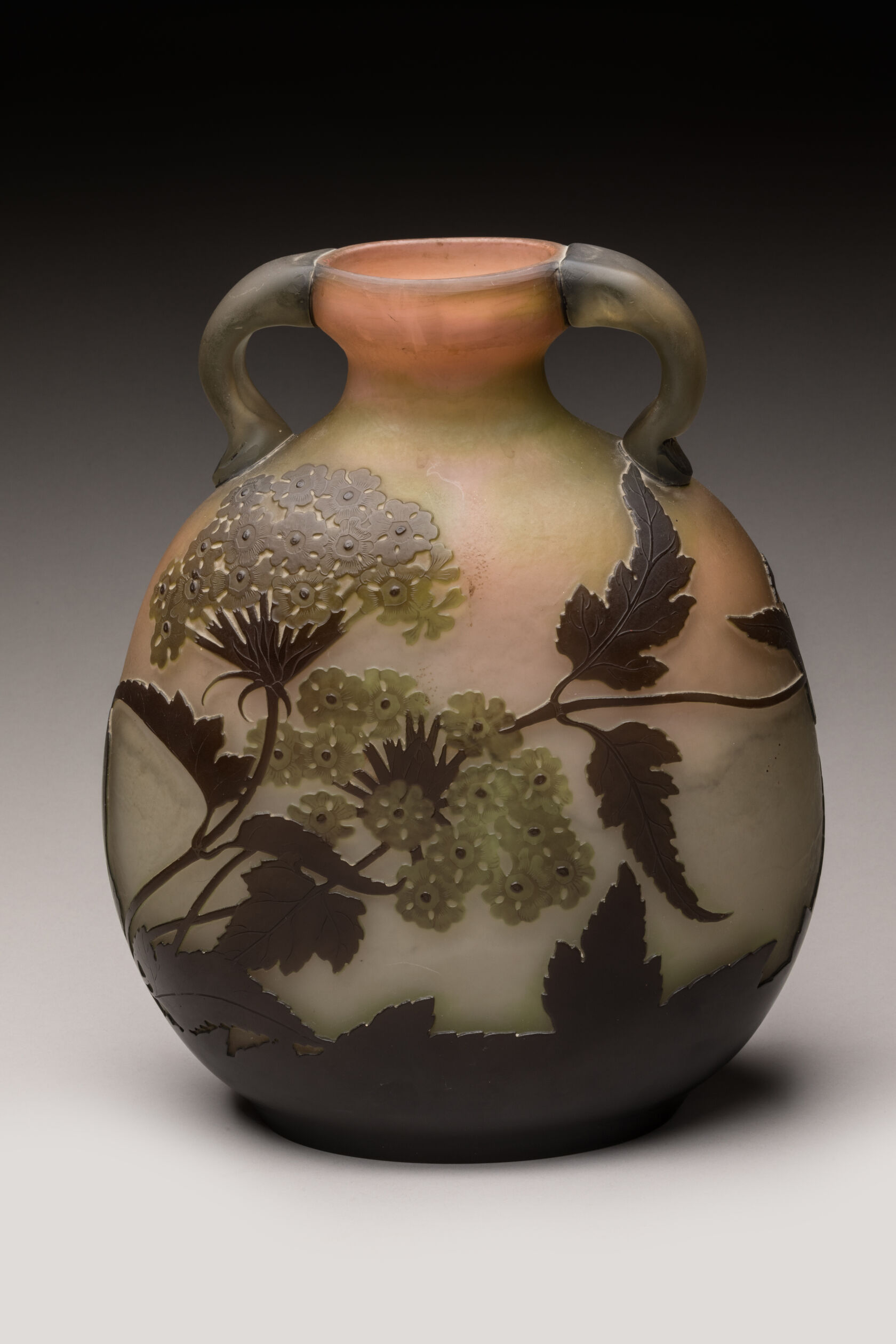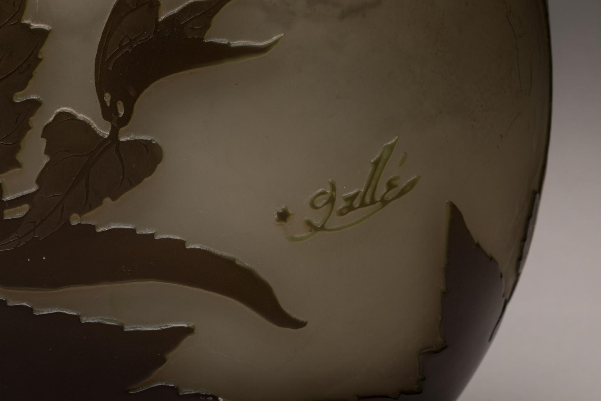 Gallé Vase de forme gourde à deux anses appliquées à décor d'ombelles brun vert sur fond beige rosé. Signature à l'étoile. H. 31 cm TR