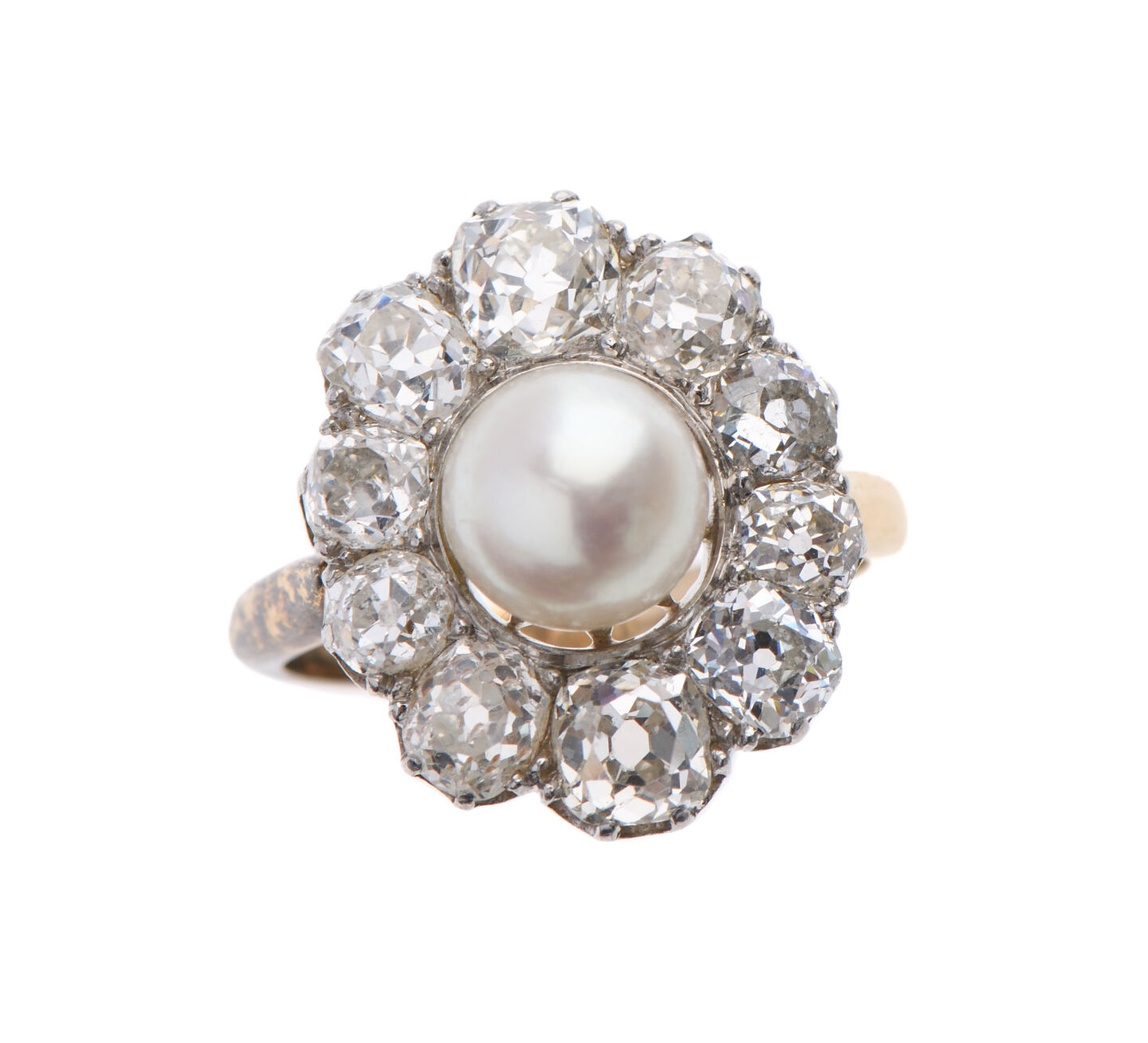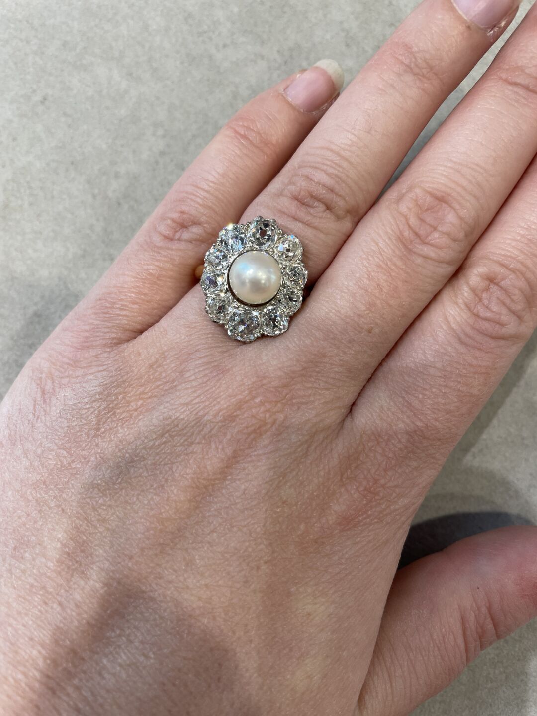 BAGUE "Pompadour" en or jaune 750/°° et gris, le plateau serti d'une perle de 8 mm dans un bel entourage de diamants de taille ancienne, les plus important de 0.35 à 0.40 ct environ. Poids total des diamants: 2.5 ct environ. Le plateau vers 1900, l'anneau rapporté et le panier modifié. Tour de doigt : 56. Poids brut :8.7 g.