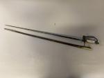 Monture laiton une branche ciselée, poignée nacre, clavier à l'aigle, lame droite à arrêté centrale dorée et bleuie au tiers (oxydation ) fourreau cuir à deux garnitures laiton ciselé ( accidents )