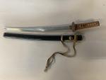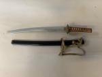 Poignée galuchat tressée, lame à faible courbure et gravée en son milieu , tsuba fer, fourreau bois et laiton, restaurations d'usage, en l'état