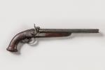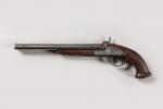 Monture bois à fût court, calotte fer avec coquille saint Jacques faisant office de réserve de capsule, platine avant à piston, canon en tables marqué en lettres d'or « DAMAS TURC « manque un chien, mauvais état