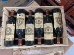 12B rouge Bordeaux Saint Emilion GCC, Château l'Angélus, 1982. Niveau haute épaule à bas goulot. Etiquettes tachées et déchirées, dans leur caisse bois ouverte.