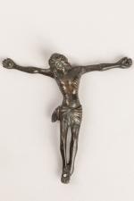 CHRIST en bronze patiné, pieds juxtaposés, périzonium noué à droite. Epoque XVIème - XVIIème siècle. H. 15 cm. Légères usures à la patine.