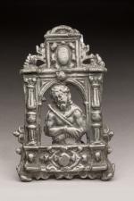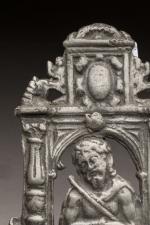 Baiser de Paix en étain ajouré représentant le Christ aux liens entre deux colonnes avec...