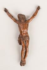 CHRIST en buis sculpté, pieds juxtaposés, périzonium noué à droite. Epoque fin XVIIème - début XVIIIème siècle. H. 22 cm. Petits accidents.