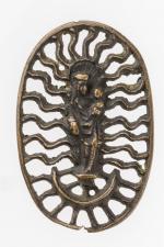 Petit MEDAILLON en bronze ajouré à décor d'une Vierge à l'Enfant, à croissant de lune...