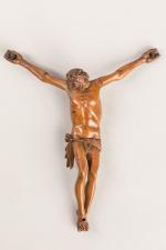 CHRIST en buis sculpté, pieds juxtaposés, périzonium noué à droite. Epoque XVIIIème siècle. Accidents (notamment clou).
