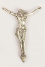 CHRIST en bronze argenté, pieds juxtaposés, périzonium noué au centre. Epoque XVIIIème siècle. H. 19 cm. Légères usures.