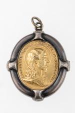 MEDAILLON en métal argenté, orné de deux plaques en bronze doré à décor d'une Vierge et d'un Christ de profil, sculpteur monogrammé I.H.. Epoque XVIIIème siècle. Hors tout : 6,5 x 5 cm. Petites usures.