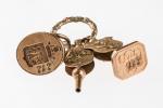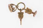 ANNEAU en or 750 °/°° à décor feuillagé supportant un cachet en or 750 °/°° à décor de lion et d'une fleur en applique, une clef de montre au même décor et un sceau en ovale à décor d'une tour entourée de deux lions, surmontée d'une couronne, prise en forme d'entrelacs. Epoque XIXème siècle. Poids : 33,5 g.