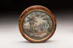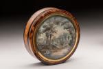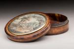 BOITE ronde en loupe d'amboine, intérieur écaille, ornée d'une miniature sur vélin figurant des personnages...
