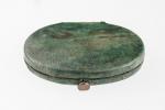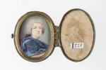 ECOLE FRANCAISE du début du XVIIIème siècle. Portrait d'homme à la perruque en habit bleu. Miniature en ovale sur vélin. 4,5 x 3,7 cm. Dans un étui en galuchat vert accidenté.