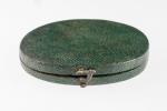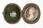 ECOLE FRANCAISE du XVIIIème siècle. Portrait de jeune femme en robe bleue. Miniature en ovale sur ivoire. 3,5 x 3 cm (à vue). Petit encadrement en or jaune 585 °/°°. Poids brut : 5,6 g. Le tout dans un étui en galuchat vert ovale, accidenté, postérieur. Monture cassée, non poinçonnable par le bureau de garantie.