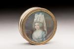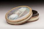 TABATIERE en vernis blanc, monture en pomponne, intérieur en écaille brune, le couvercle ornée d'une miniature sur ivoire à décor d'une femme en robe bleue, châle de mousseline blanche et haute coiffe à la Marie-Antoinette. Signée de Jean-Pierre Thiboust (1763-1825), datée 1787. H. 2,5, D. 7,5 cm.