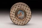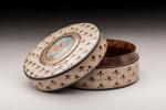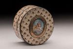 BOITE à PILULE en écaille à décor en vernis Martin sur fond rose strié de fleurettes rouges ou vertes. Le couvercle est centré d'un médaillon à décor en miniature d'un angelot sur un oiseau, encadré de métal plaqué or à décor feuillagé. Epoque Louis XVI. Boîte : H. 2,5, D. 5 cm. Accidents et manques.