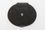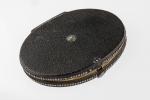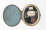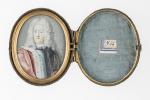 ECOLE FRANCAISE début XVIIIème siècle. Portrait d'un homme à perruque, en cuirasse et manteau à l'hermine. Miniature en ovale. 6 x 4,5 cm (à vue). Montée dans un étui ovale en métal doré gainé de cuir. Petites usures à l'emboîtement, miroir au revers de la miniature piqué, ne ferme plus.