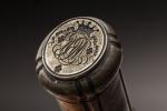 ETUI à CIRE en forme de carquois en argent, à double sceau armorié, l'un à blason entourée de lions surmonté d'une couronne comtale, l'autre à chiffre en ovale surmonté d'une couronne de marquis. Poinçon au cygne. Poids : 86 g. L. 12 cm. Infimes rayures.