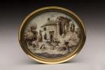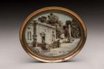 ECOLE FRANCAISE de la fin du XVIIIème - début XIXème siècle. Les lavandières près des ruines du temple aux environs de Rome et Femmes près de la fontaine près d'une maison romaine. Deux miniatures en ovale en grisaille sur ivoire, dans le goût d'Hubert Robert. 6,5 x 8 cm (à vue, chaque). Cadres en laiton doré.