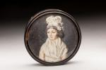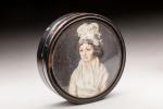 ECOLE FRANCAISE fin XVIIIème - début XIXème siècle. Boîte ronde en écaille, à décor d'une miniature circulaire figurant une femme en bonnet et châle blanc. H. 3, D. 9,5 cm. Petits manques et accidents.