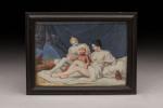 ECOLE FRANCAISE du début du XIXème siècle, dans le goût du XVIIIème siècle. L'Amour bandé entre deux femmes dénudées. Miniature à la gouache sur ivoire. 5,5 x 8 cm. Légères rayures.