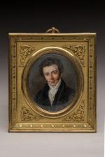 Pierre Ursin TIXIER de LA DOUCE (Actif entre 1820 et 1844). Portrait d'homme en redingote. Miniature ovale signée en bas à gauche et datée 1831. 6,5 x 5 cm. Petit cadre d'époque XIXème siècle en laiton doré. Petits manques de matière sur la partie inférieure.
