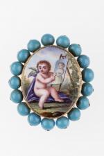 ECOLE FRANCAISE vers 1830. L'Amour à la cape violette peignant sur chevalet. Miniature ovale sur émail avec encadrement de perles de couleur turquoise. 3 x 2,5 cm. Rayures, restaurations, petits manques de matière.