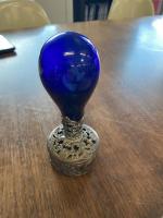 Cachet manche en verre bleuté et dessus en métal bronzé à décor d'entrelacs et coquilles , fin XIXème début XXème . H 18 cm